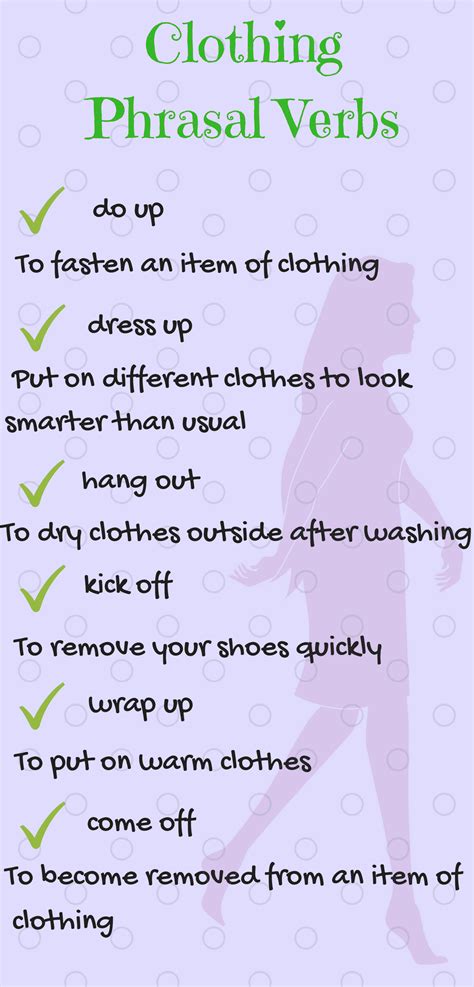 09/09/2022 · outfit: [noun] the act of fitting out or equipping (as for a voyage or expedition).Outfit definition, an assemblage of articles that equip a person for a particular task, role, trade, etc.: an explorer's outfit. See more.past tense. outfitted. past participle. outfitted. DEFINITIONS 1. 1. to provide someone or something with the clothes or equipment that they need for a particular purpose. a van that is …outfit definition: 1. a set of clothes for a particular event or activity: 2. an organization, company, or any group…. Learn more.English verb conjugation to outfit to the masculine. Irregular verb: outfit - outfit, outfitted - outfit, outfitted.This is a reference page for outfit verb forms in present, past and participle tenses. Find conjugation of outfit. Check past tense of outfit here. ... One can check verbs forms in …It can help to buy all your clothes for one outfit at the same store and to use colors and styles that are most flattering for your face and body type. 0. 0. If you're used to wearing jeans and t …Clothes verbs: Do up, dress up, wear, try on, match, fit..., learn more with The English Alleymain menu. vocabulary. verbs. grammar. reading. lyrics. idioms. tonguetwisters. word list:27/09/2018 · absorb accentuate accesorize air dry blend breathe click complement cover cushion cushion design drape dress down dress up dry clean dry clean embellish engineer layer look …